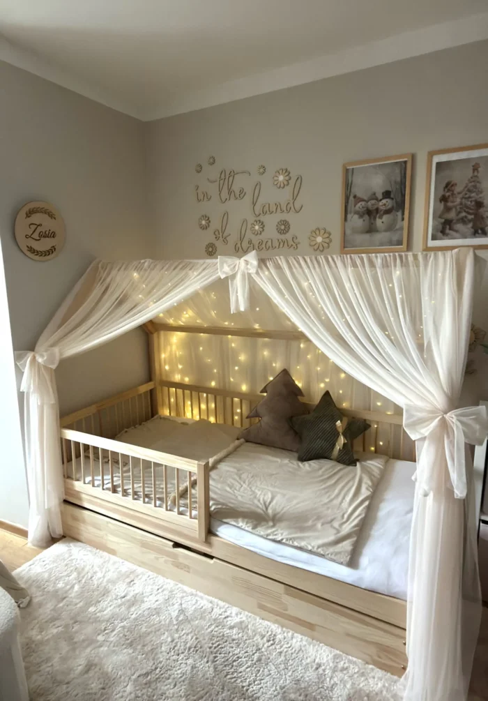 Závesy šijeme s láskou v našej vlastnej dielni. Na každý set používame približne 7 metrov tylu na jednu stranu, čím vytvárame nadýchaný efekt „wow“ – dokonalý pre domčekové postele.
