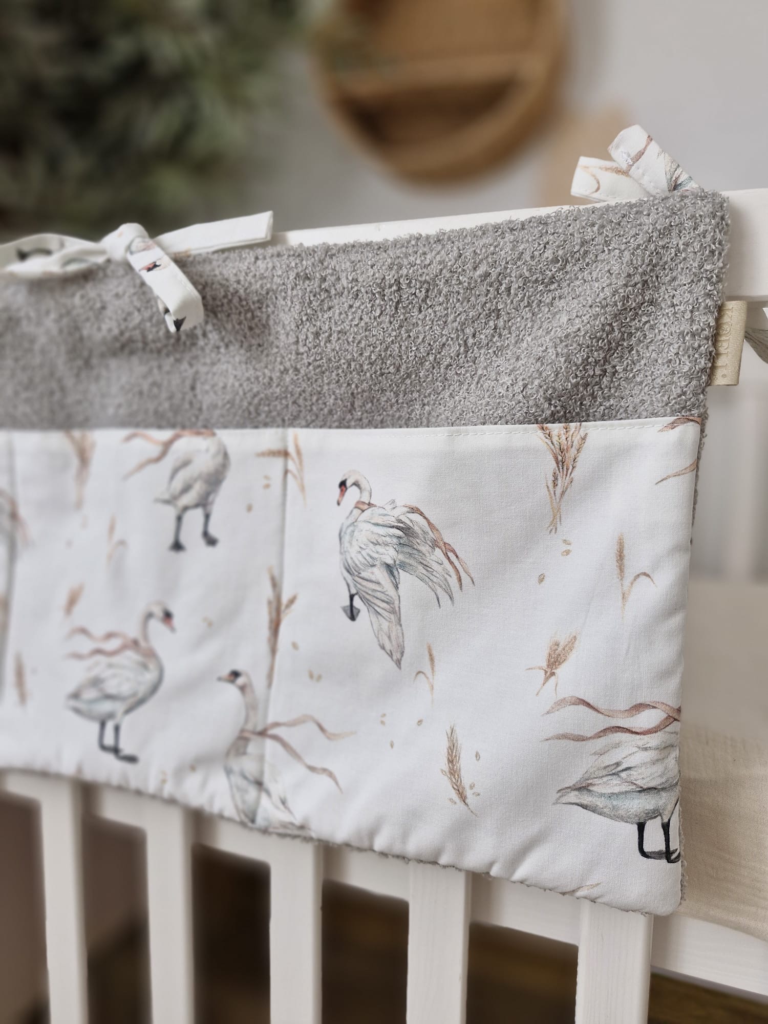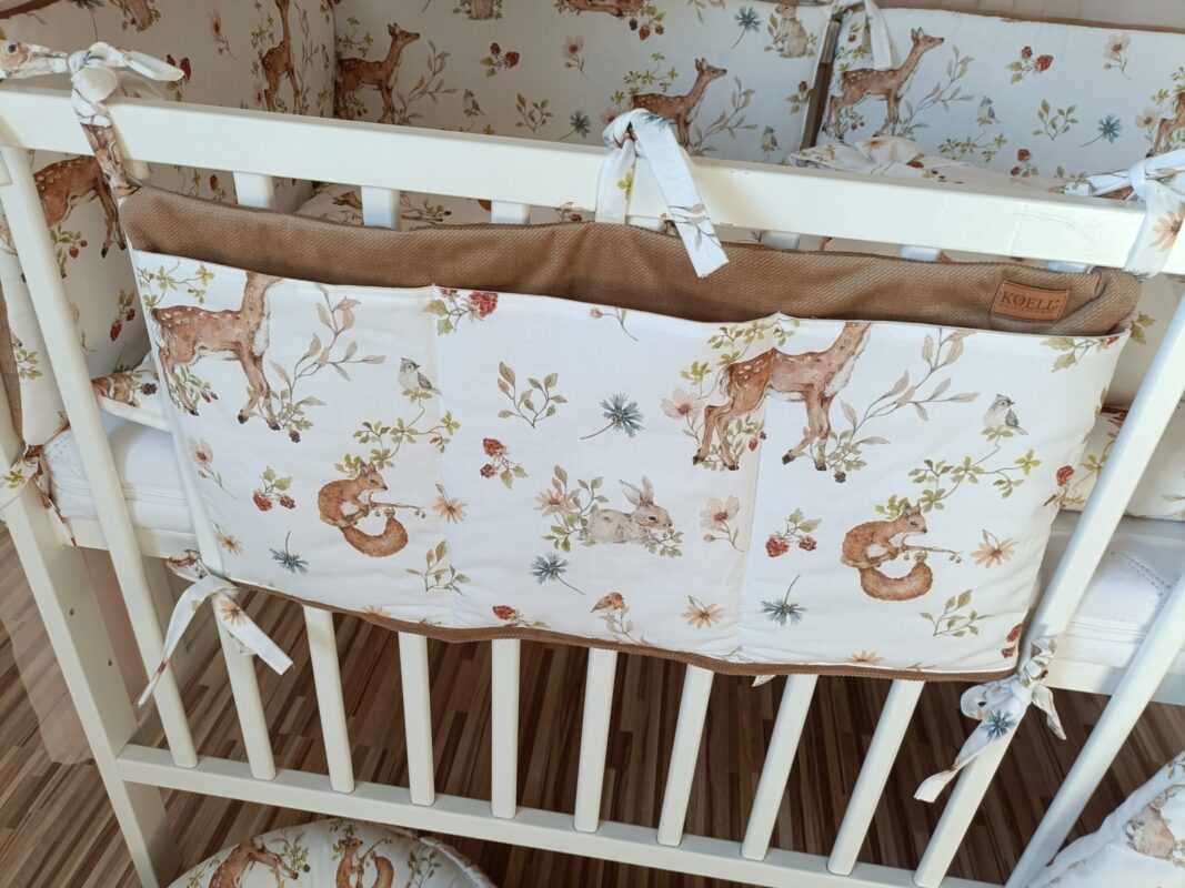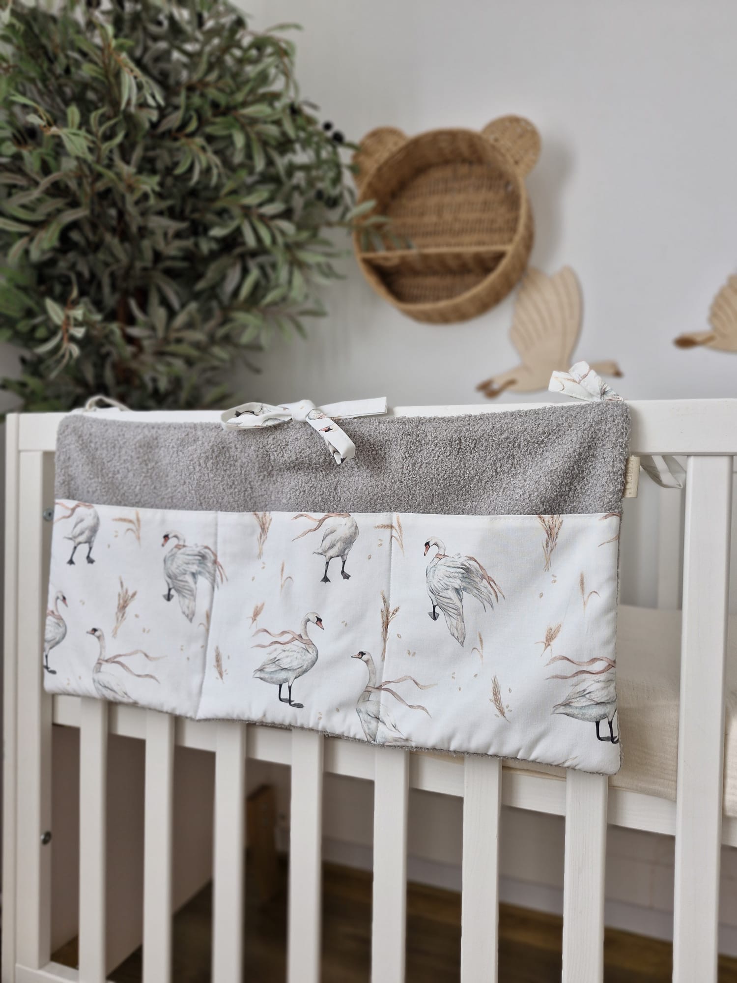 Praktický a užitočný organizér viazaný na priečky. Pomôže vám to mať najnutnejšie veci na dosah. Má 3 priestranné vrecká, dlhé šnúrky, vďaka ktorým môžeme organizér pevne priviazať k postieľke.